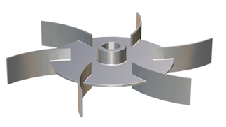 ②渦輪式攪拌器:由在水平圓盤上安裝2~4片平直的或彎曲的葉片所構(gòu)成。槳葉的外徑、寬度與高度的比例,一般為20:5:4,圓周速度一般為 3~8m/s。渦輪在旋轉(zhuǎn)時造成高度湍動的徑向流動,適用于氣體及不互溶液體的分散和液液相反應(yīng)過程。被攪拌液體的粘度一般不超過25Pa·s。